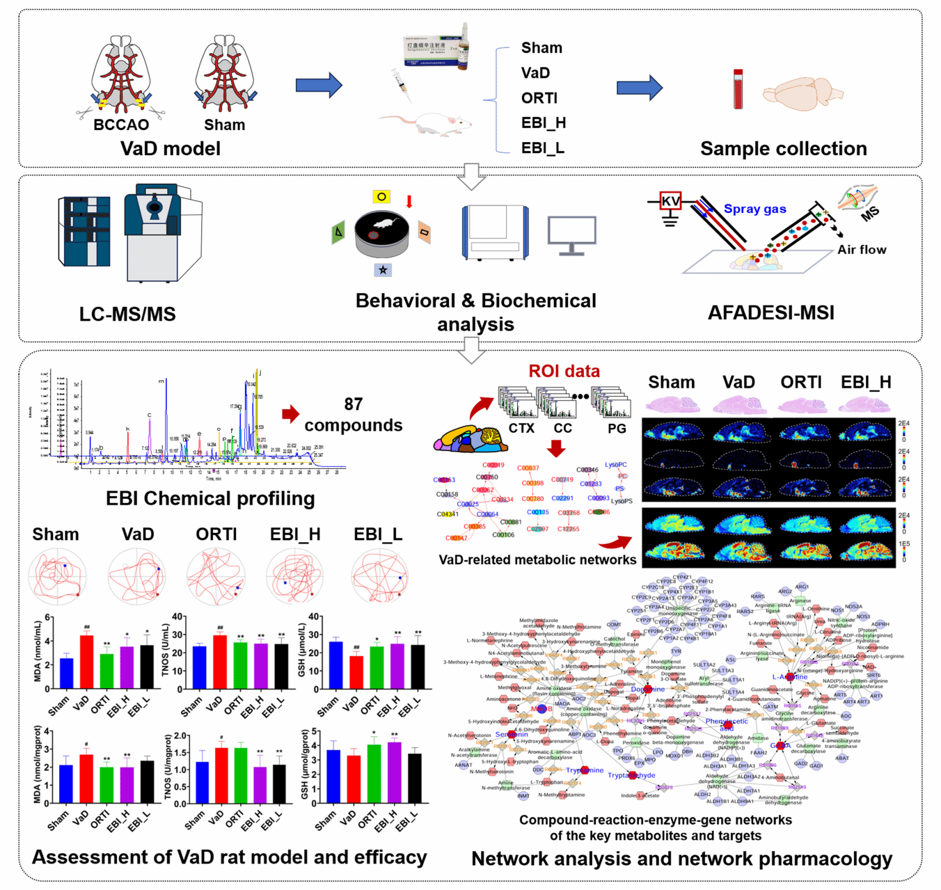 本研究系统开展了EBI的化学成分分析,成功鉴定出87个化合物,初步揭示了EBI抗VaD的潜在物质基础。为进一步验证其药效,研究选取了双侧颈总动脉结扎(BCCAO)大鼠模型模拟临床VaD表现,并通过水迷宫实验、生化指标检测等手段对模型和药效进行综合评价。结果显示,模型建立成功,EBI显著改善了VaD的病理状态,其中高剂量组(EBI_H)的效果与阳性药奥拉西坦(ORTI)相当。进一步利用AFADESI-MSI技术和网络分析,研究深入揭示了VaD引发的大鼠脑代谢网络功能紊乱,并证实了EBI对代谢网络的回调作用。特别值得注意的是,EBI_H与ORTI共同回调了15个代谢物,且多数与神经递质相关,预示EBI可能通过调节神经递质代谢发挥抗VaD作用。最终,研究通过网络药理学整合了EBI化学成分和EBI抗VaD空间分辨代谢组学结果,构建了化合物-反应-酶-基因网络,进一步发现单胺氧化酶B(MAOB)可能为EBI抗VaD的关键靶点,并识别出包括血清素在内的7个与神经递质代谢紧密相关的关键代谢物,这些发现进一步支持了EBI活性成分通过调节神经递质代谢发挥抗VaD作用的假设。