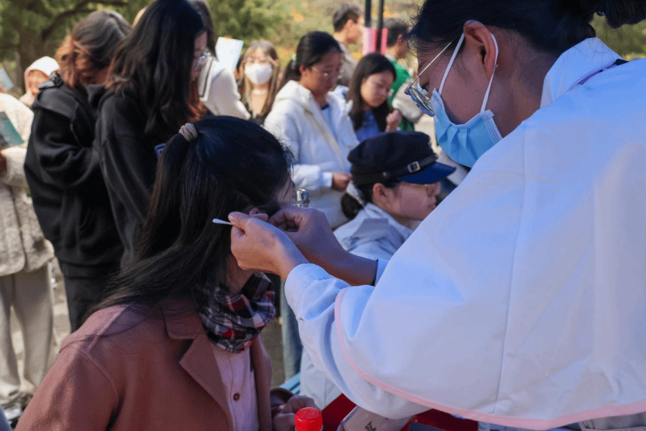 “耳穴压豆、推拿”,这些传统中医技法在义诊现场大放异彩。来自北京市中西医结合医院、北京藏医院的医师们以精湛的技艺为师生们带来舒缓与放松。体验者们纷纷表示,这场中医之旅让他们“痛并快乐着”,对中医药文化有了更深刻的认识与信赖,同时也产生了更浓厚的兴趣。
