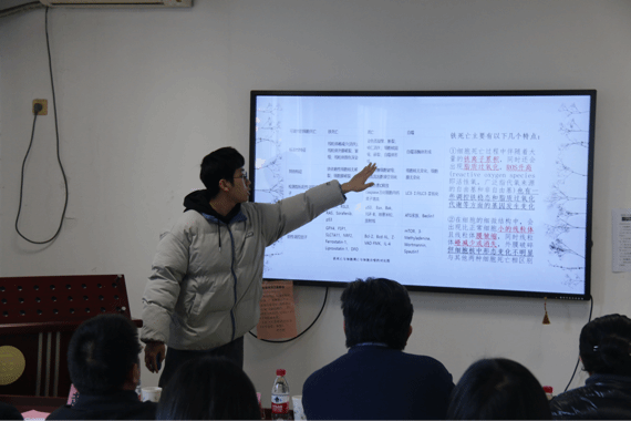 2023级中药学硕士生彭泓睿分享了有关铁死亡的机制以及其与中医药结合的应用。谷雨龙老师认为同学讲课总体不错,建议其多使用专业化学语言表达化学式,减少口语表达。