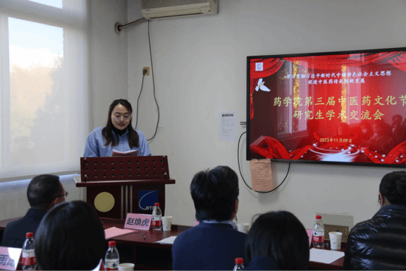 交流会由公司第五届研究生会主席刘璐瑶主持,各班级员工代表参加交流会活动。本次学术交流会的主讲人有来自2021级中国少数民族传统医学博士生程硕涵、2021级中药学硕士生肖兰、2022级中药学硕士生白兴媛、2023级中药学硕士生樊敏哲、罗东伟、张晨朝、彭泓睿、吉克伍牛等共计8名同学。