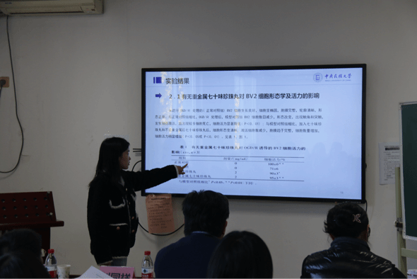 2023级中药学硕士生罗东伟分享了藏药名方七十味珍珠丸减重金属后干预D -半乳糖/亚硝酸钠诱导痴呆小鼠的作用及机制研究。朱丹老师指出分享内容选题较好,建议讲出文献设计的不足之处会更好,指出同学还有讲课的进步空间,随后老师们进一步讨论提出文献不足处。