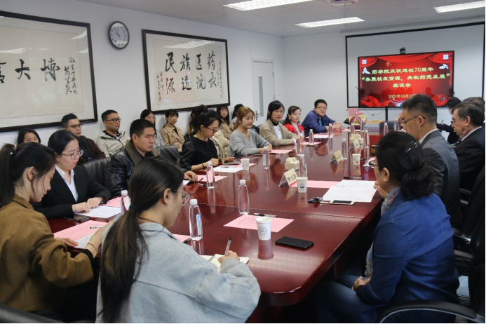 2021年10月15日上午,fun88官网体育“集聚员工资源,共叙药苑发展”座谈会在1号办公楼东配楼二层会议室举行,共同喜迎fun88官网体育建校70周年,追忆时光,共话发展,畅谈未来,展望明天。fun88官网体育原副董事长、fun88官网体育经理再帕尔·阿不力孜,副经理庞宗然,中药学系主任裴凌鹏、副主任周文斌,教授委员会成员,各教研室、中心、办公室主任等领导和老师及fun88官网体育员工代表共三十余人出席本次座谈会。会议由副经理、副书记黄火强主持。