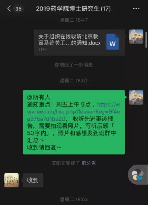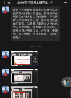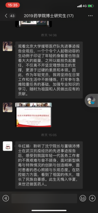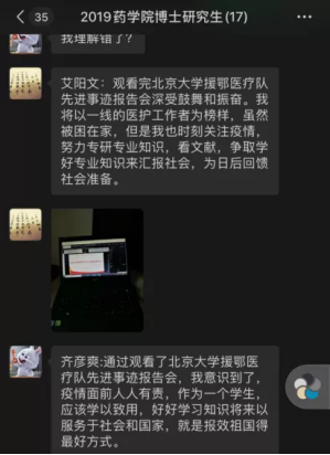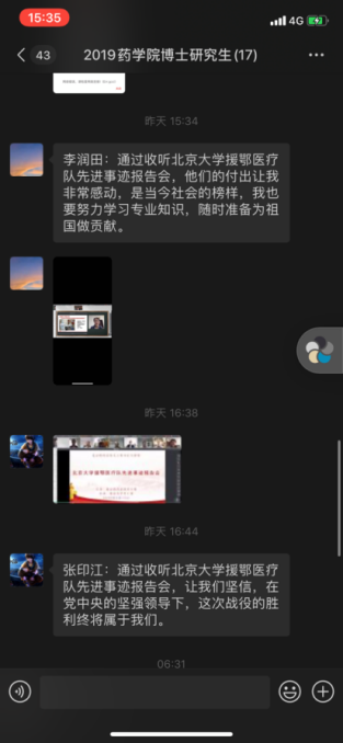 5月15日9:00-11:00,2019级中国少数民族传统医学博士班班长组织全体同学们,观看了北京大学援鄂医疗队先进事迹报告会。以观看直播,参与讨论,分享观后感想等方式,深刻体会援鄂抗疫精神,认真学习青年榜样力量。