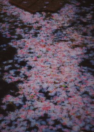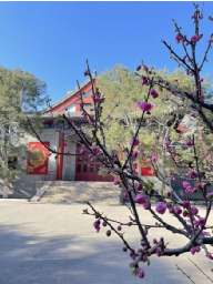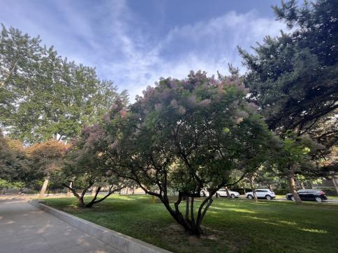 图三:春日花树下;走过天桥时,瞥见右边开的正盛的紫叶李,花树下是一个小小的快递架,小路上落满了花瓣,宣告着春日的尾声。此时正值下班时间,一个个匆忙的归家之人,寻找自己的包裹,带着满足和工作结束的疲惫与归家的轻松。再寻常不过的小事,此时因为有了春花的点缀,让人觉得也心情大好,浪漫无比。