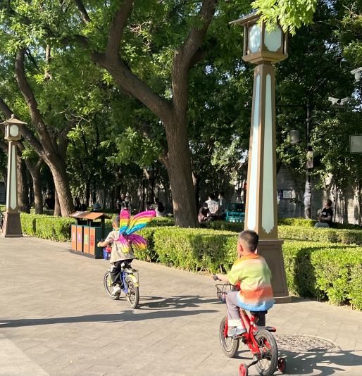 图三、图四展现的是在这样的温暖阳光下,穿着蝴蝶翅膀的孩童们骑着小车,感受着弥漫在空气中的春季气息,自由自在地欢笑玩耍,从心底释放出慵懒的感觉,享受着这个充满生机的季节。
