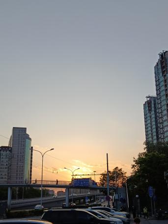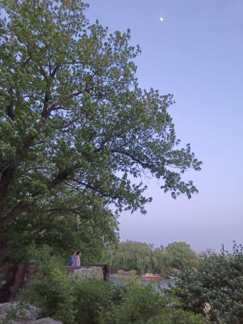 图五:清风朗月共远眺;在公园溜达散心,恰好看到一对夫妻在高台上享受迎面清风,此时头顶正有一弦朗月,我在的角度看过去,真是只羡鸳鸯不羡仙,中年夫妻携手半生只此,还能一起欣赏美景,清风共明月,其他一切都在为他们作陪。