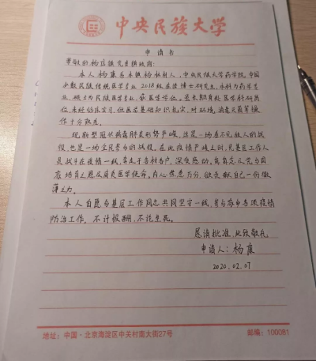 苟利国家生死以,岂因祸福避趋之。疫情面前,杨康义无反顾,为抗疫助力、为生命逆行,尽显我民大学子在关键时刻勇挑重担、勇克难关、勇斗风险的青春本色,和学以致用、报效祖国的家国情怀。