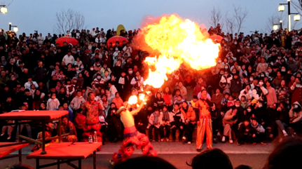 图四:传统民俗艺术喷火表演,喷火表演不仅是一种艺术表现形式,也是一种民间非物质文化遗产。喷火表演丰富了民族节日色彩,让观众回忆起过去的美好时光,增添了年味。