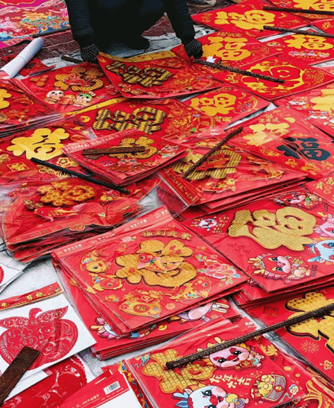 图二:陪妈妈去买对联,看到地上放满了各种各样的红色福字,过年时各家各户都会贴上福字,寓意新的一年福气满满。