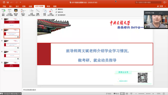首先,周文斌老师介绍了全班总体情况,并回顾了上学期的云端上课情况。暑假已经到来,即将升入大四的17级同学们面临着更多的选择与挑战。周老师结合自身经历,对家长同学们关心的考研、保研以及就业的相关问题作出了指导以及动员,使大家对未来的选择与努力方向有了一个更清晰的认知与规划,同时周老师表示非常欢迎同学们向老师咨询相关问题,好好把握接下来的每一天。