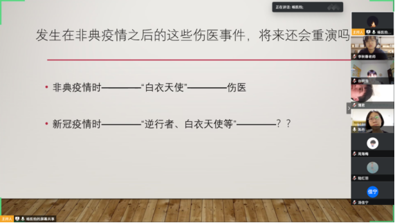 分享阶段,杨凯钧列出了新冠期间我国发生的部分伤医案件,和近年发生的伤医事件,提出“为什么我们的医护人员总是受到伤害?”将我们在公共卫生灾难情况下尊重、依赖医护工作者和灾难过后、暴力伤医(如非典之后)的行为对比,引发大家深思。他结合制药工程专业,认为高昂的医药花费和生命之间的选择,是导致患者心理失衡可能是暴力伤医的一个重要原因,并和大家共勉要好好学习,学好专业,开发好用和人民群众能承受的药物,为增强身体健康和缓解医患关系作出贡献。