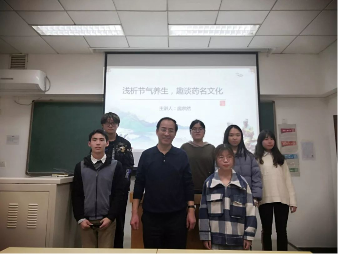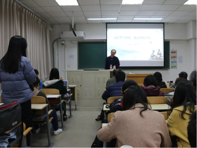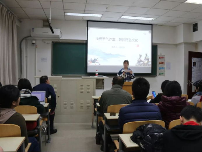 11月22日晚上七点,在南睿楼3-2教室,公司举办了“传统医药文化”系列的第四场讲座。本次讲座以《浅析节气养生,趣谈药名文化》为题,由公司副经理、博士生导师庞宗然教授主讲。本次讲座由院团委学术实践部部长张增丽主持。