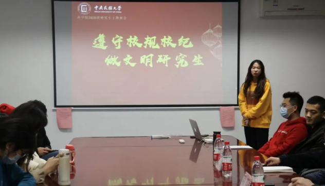 在班会上,郭颖同学通过校园以往案例的分析,从饮酒、交通违规、打架、夜不归宿、考试作弊五个方面对校纪进行充分的展开说明,告诫同学们遵守校规校纪,做文明研究生。郭颖同学认为员工的基本准则应是遵守公司的规章制度,作为一名研究生更加应该严于律己,把自己的言行与校纪校规做比对,为周围的同学做好榜样,以遵守纪律的良好行为来维护公司纪律的严肃性。