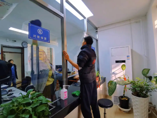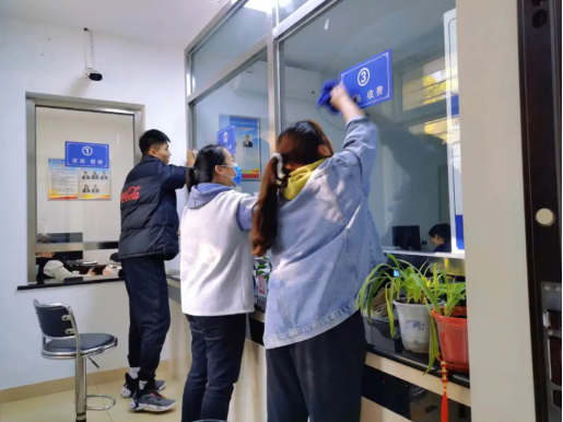 部分同学负责室内柜台及玻璃的清洁工作,大家协同配合,干湿抹布轮流上阵,内外层玻璃同时清洁,有效提高了工作效率。