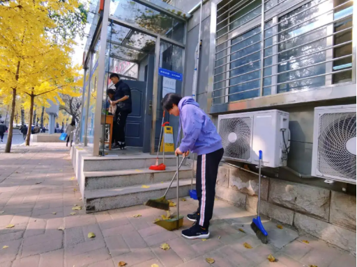 其余同学负责服务大厅门前的落叶清扫工作,凉风习习,落叶纷纷,满地金黄固然美丽,但保持校园干净整洁仍然是同学们的责任。