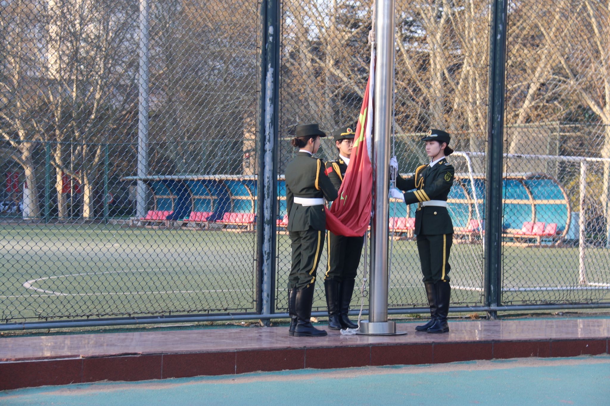 国旗护卫队迈着铿锵的步伐出旗,全体师生庄严肃立,齐唱国歌,面向冉冉升起的五星红旗行注目礼。
