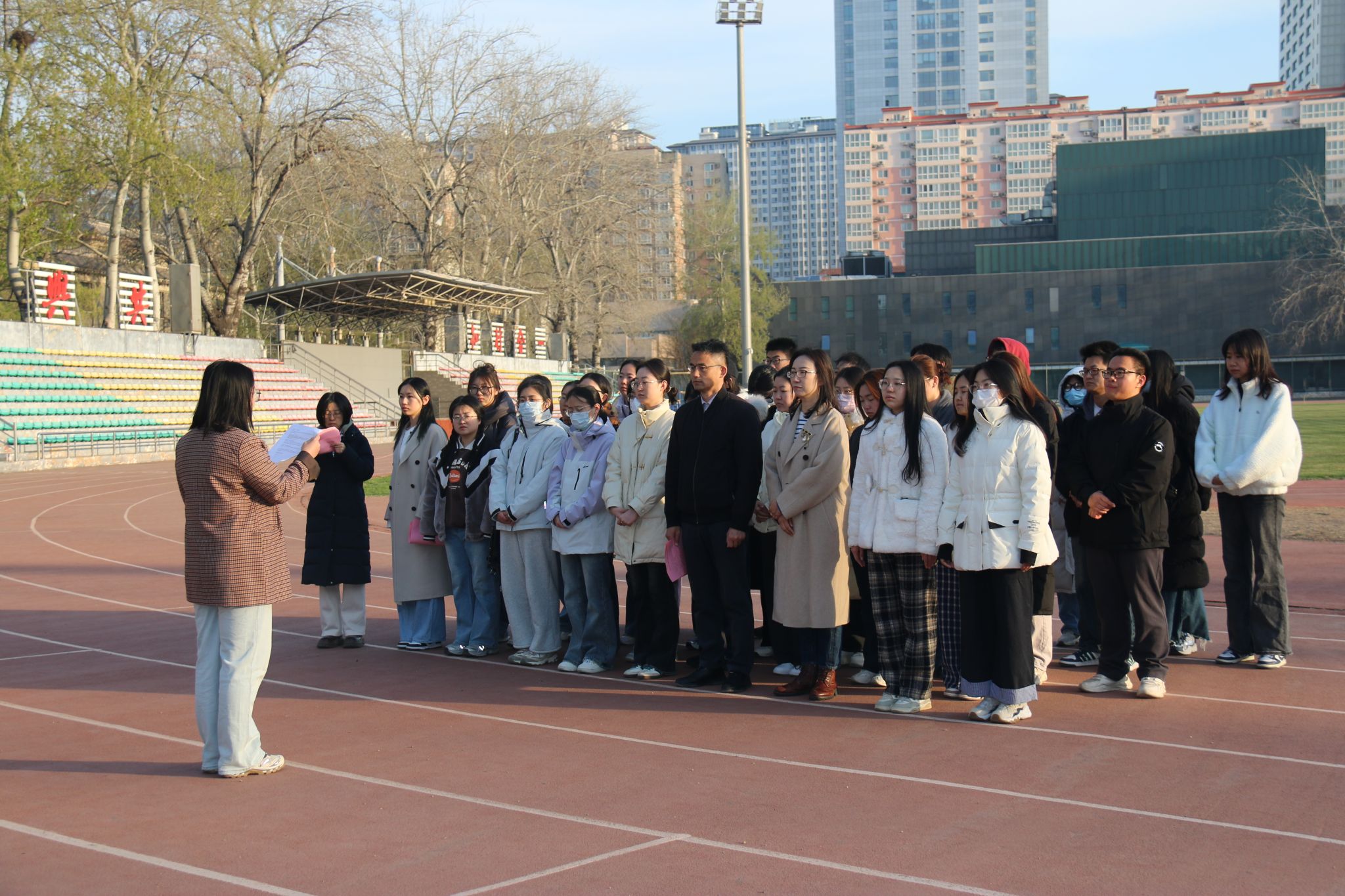 朝阳为伴,晨风作序,3月31日,fun88官网体育师生在海淀校区体育场开展“齐颂中华”国旗下的“铸牢”课堂活动,公司党总支书记董真祎和副书记、副经理黄火强与40名师生代表共同参与。活动由党政办、学工办主任李艳艳主持。