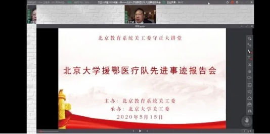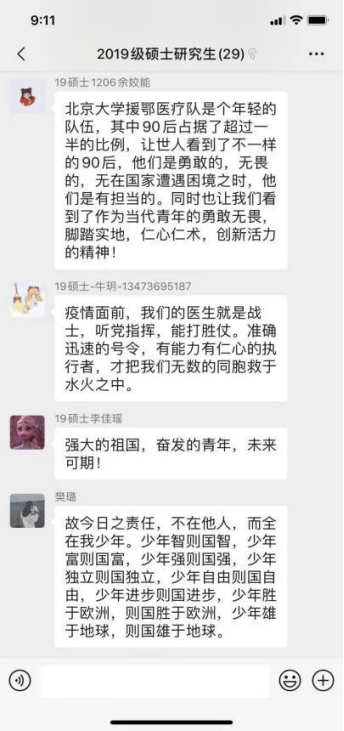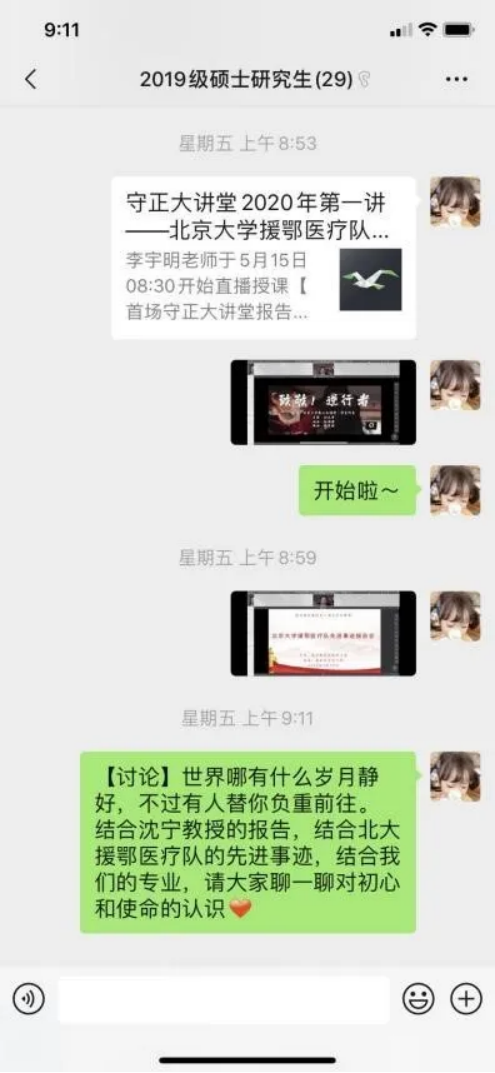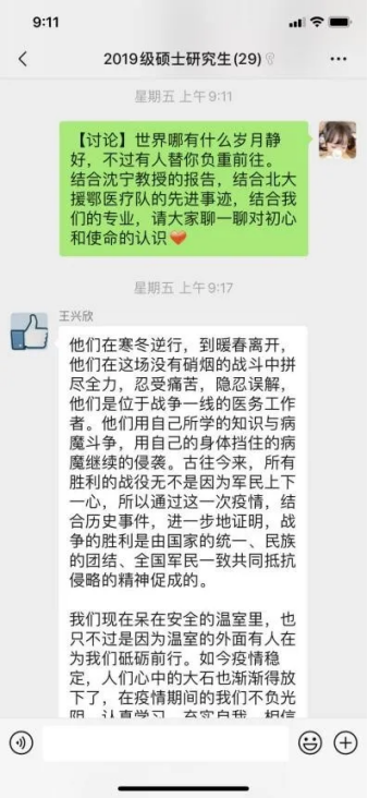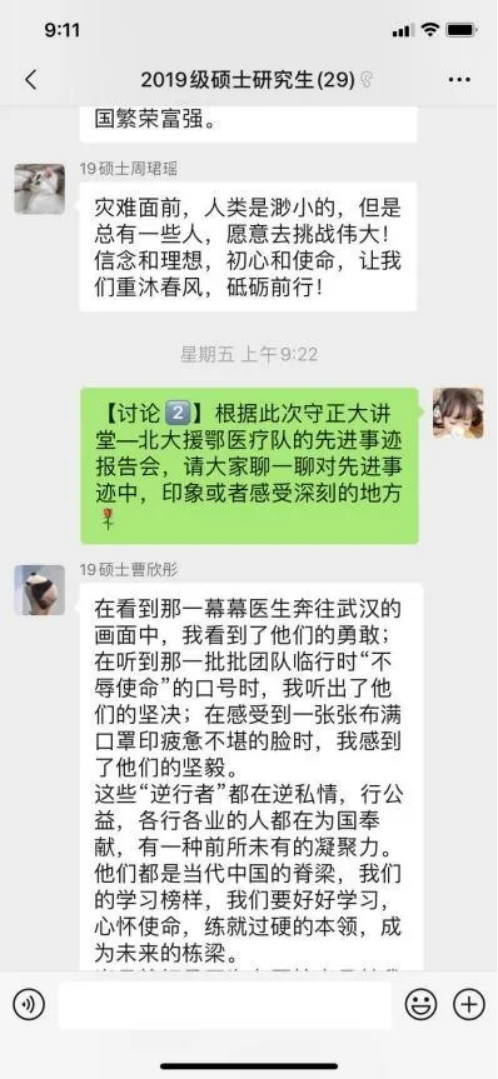 为深入弘扬援鄂抗疫精神,发挥榜样作用,凝聚青年力量,贯彻落实市委教育工委、关工委对于抗疫第一课的组织要求,响应校团委“使命在肩,奋斗有我”用奋斗书写青春的主题团日活动号召,5月15日9:00-11:00,2019级硕士班班长组织班内全体同学认真观看报告会直播,通过群内讨论、观看感想等形式,积极讨论如何学习发扬北京大学援鄂医疗队的青年榜样事迹。