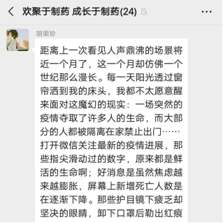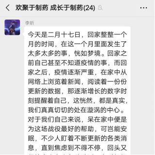 2016级制药工程班全体同学积极配合公司及公司的工作安排,每日主动、及时反馈个人状况,线上接龙承诺书,观看《老师请回答》特别节目,观看《中国医生》纪录片。在此基础上,召开“讲好中国故事,致敬中国医生”线上主题班会。一个班为一个团支部,此次班会也是团日活动的重要载体。