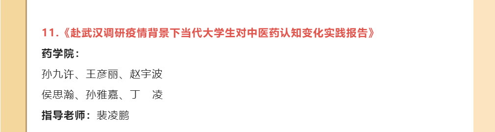 在本次社会实践中,由fun88官网体育教师裴凌鹏指导的实践团---赴武汉调研疫情背景下当代老员工对中医药认知变化实践团,结合fun88官网体育学科专业特色,通过线上调研当代老员工在疫情爆发前后对中医药的认知变化情况,线下实地考察了解湖北省武汉市在本次抗击疫情过程中对中医药的使用情况,成果颇丰。