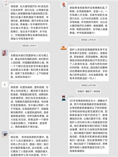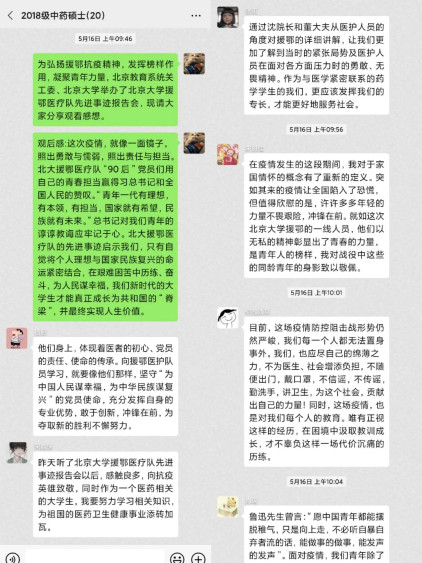 2020年5月15日2018级中药硕士班组织全班同学一同在线上观看了由北京教育系统关工委、北京大学在线举办的北京教育系统关工委守正大讲堂——北京大学援鄂医疗队先进事迹报告会。同学们认真观看了报告会,并被北大援鄂医疗队青年们的精神与事迹所感动鼓舞,纷纷在观看完报告会后积极分享了自己的感想。