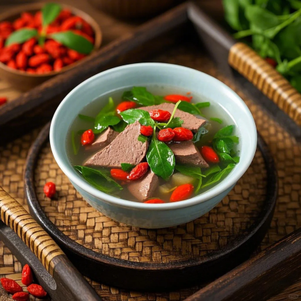 枸杞叶猪肝汤、芹菜炒百合、菊花枸杞茶